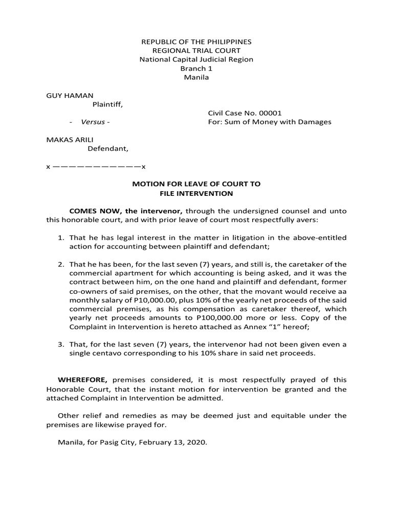 Sample Motion For Leave of Court To File Intervention PDF